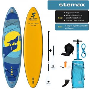 • SUP Board | Fiberglas Hybrid Paddel | Rucksack mit Tragegurte | Doppelhubpumpe | Leash | Finnen | Repairkit