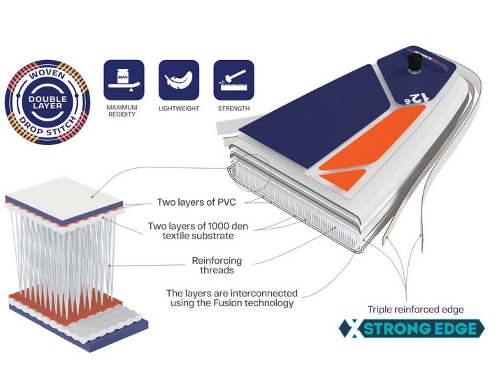 Die Double Layer Fusion Technologie steht für höchste Materialqualität und Effizienz. Zwei Schichten hochwertiges PVC werden unter kontrollierter Hitze und Druck miteinander verschmolzen, anstatt verklebt. Dieses Fusionsverfahren sorgt für ein besonders leichtes, steifes und langlebiges SUP Board, das selbst bei hohen Drücken (bis zu 26 PSI) seine Form perfekt behält. Das Ergebnis: bessere Performance, höhere Stabilität und geringeres Gewicht im Vergleich zu herkömmlichen Double-Layer-Konstruktionen.